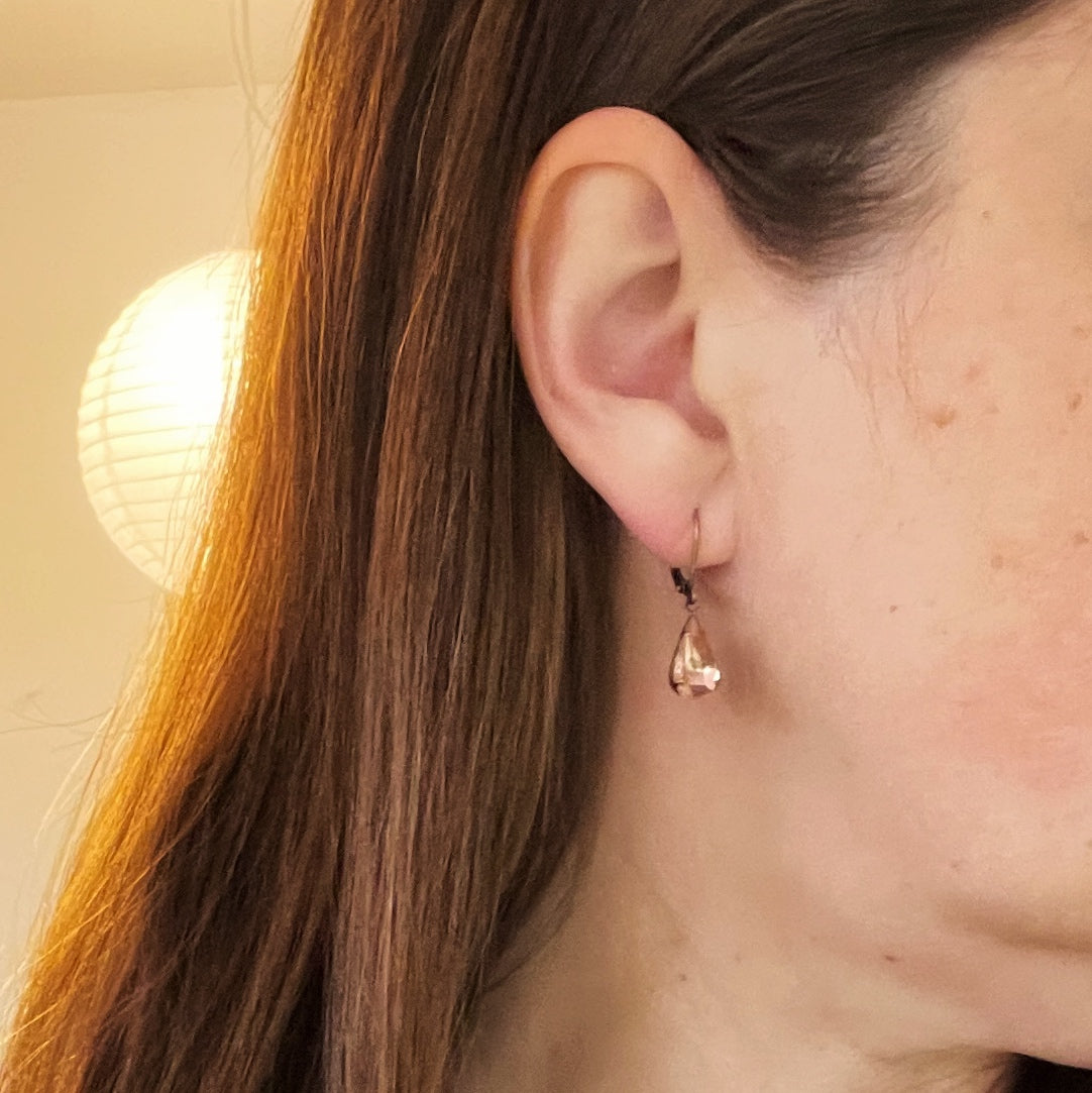 Vintage glass teardrop rhinestones in Light Rose from 1945-65 West Germany are set in new prong settings.