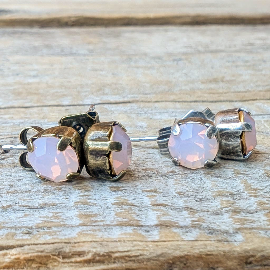 Small vintage glass round rhinestones in Pink Opal from Swarovski in Austria are set in new antiqued silver and antiqued brass prong post settings (lead-free, nickel-free). Earring posts are hypoallergenic surgical stainless steel.