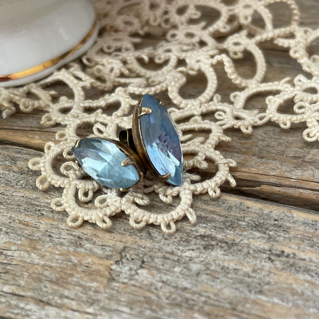 Ice Blue vintage navette rhinestones from 1950s Czechoslovakia are set in new antiqued brass-plated prong settings with surgical stainless steel posts.